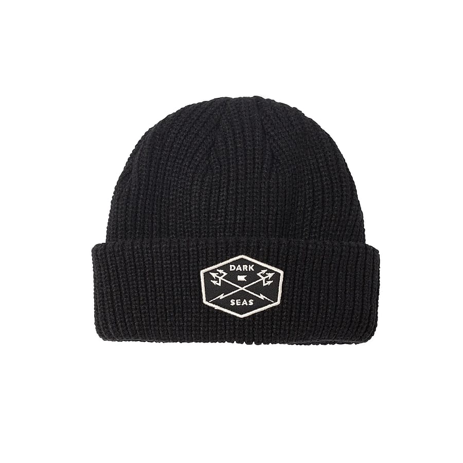 Regular fit super heavyweight 3-ply yarn beanie with cuff Embroidered twill patch on cuff Tridents embroidery on crown Dark Seas woven label branding 100% acrylic Sku: 321100092