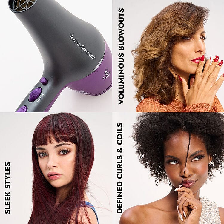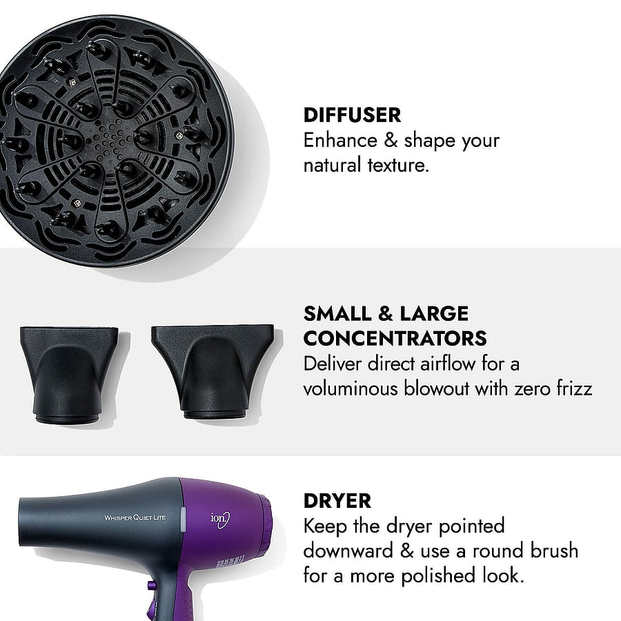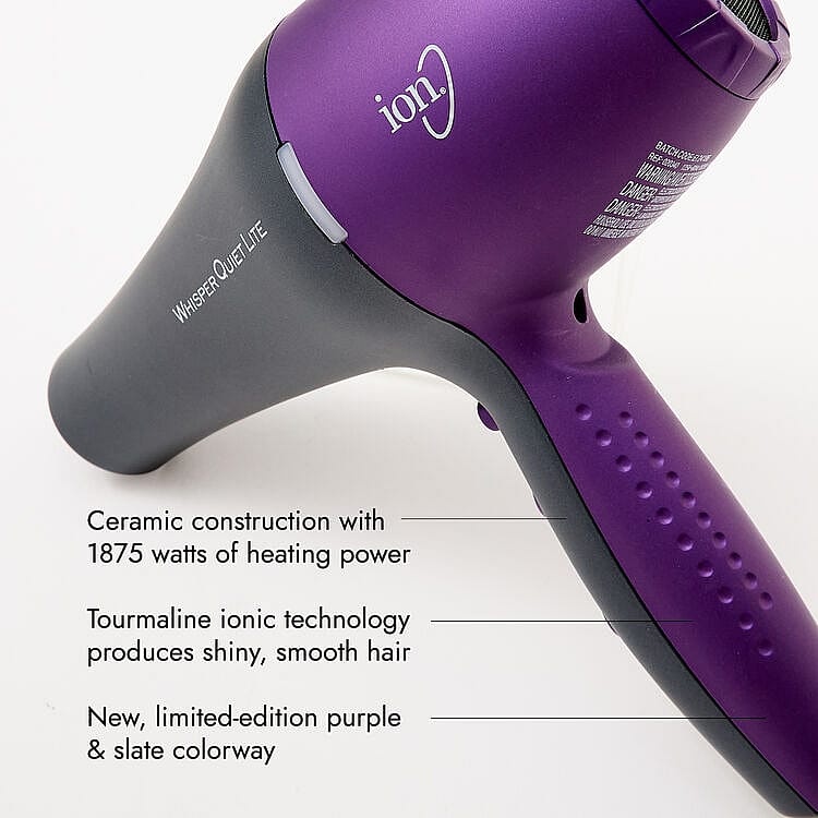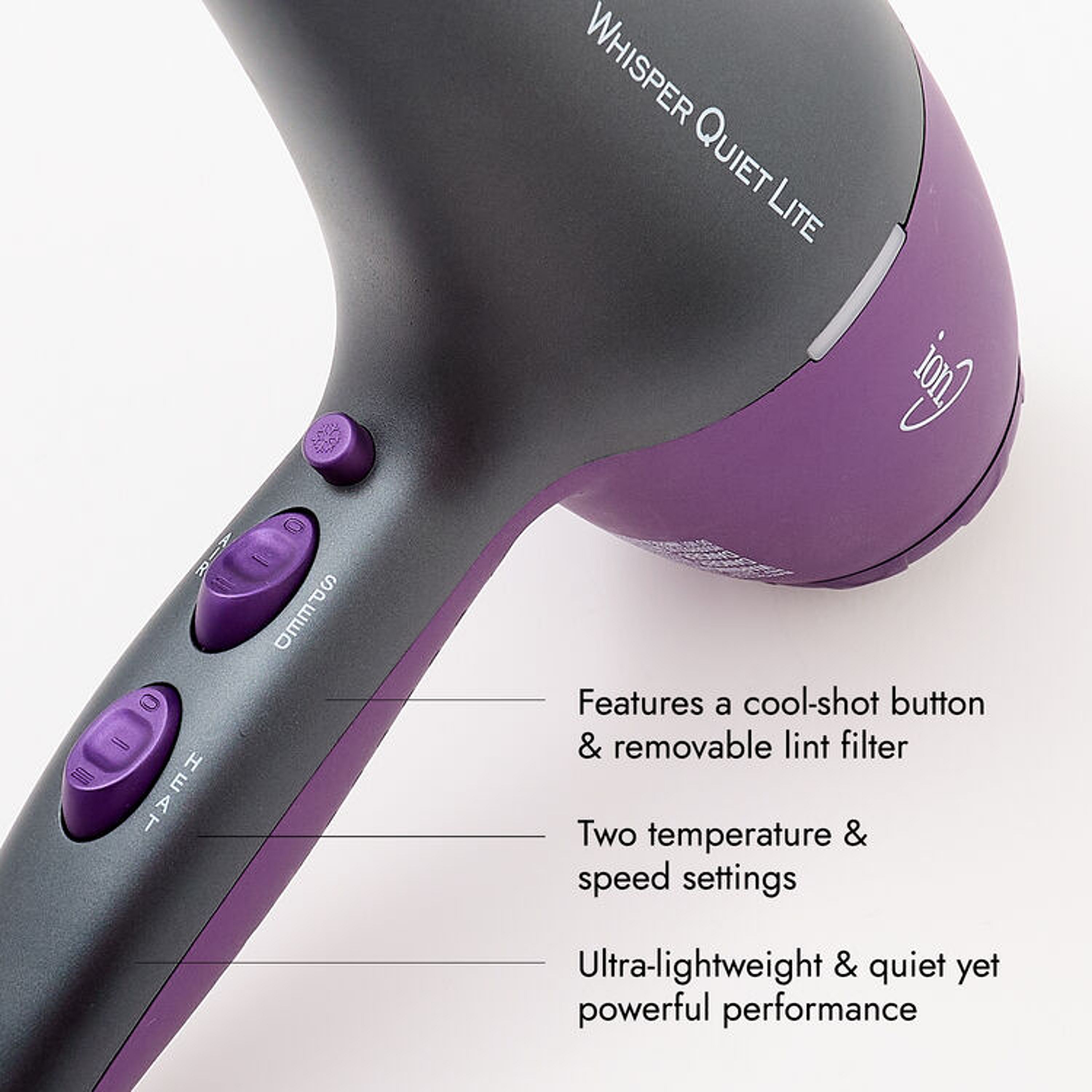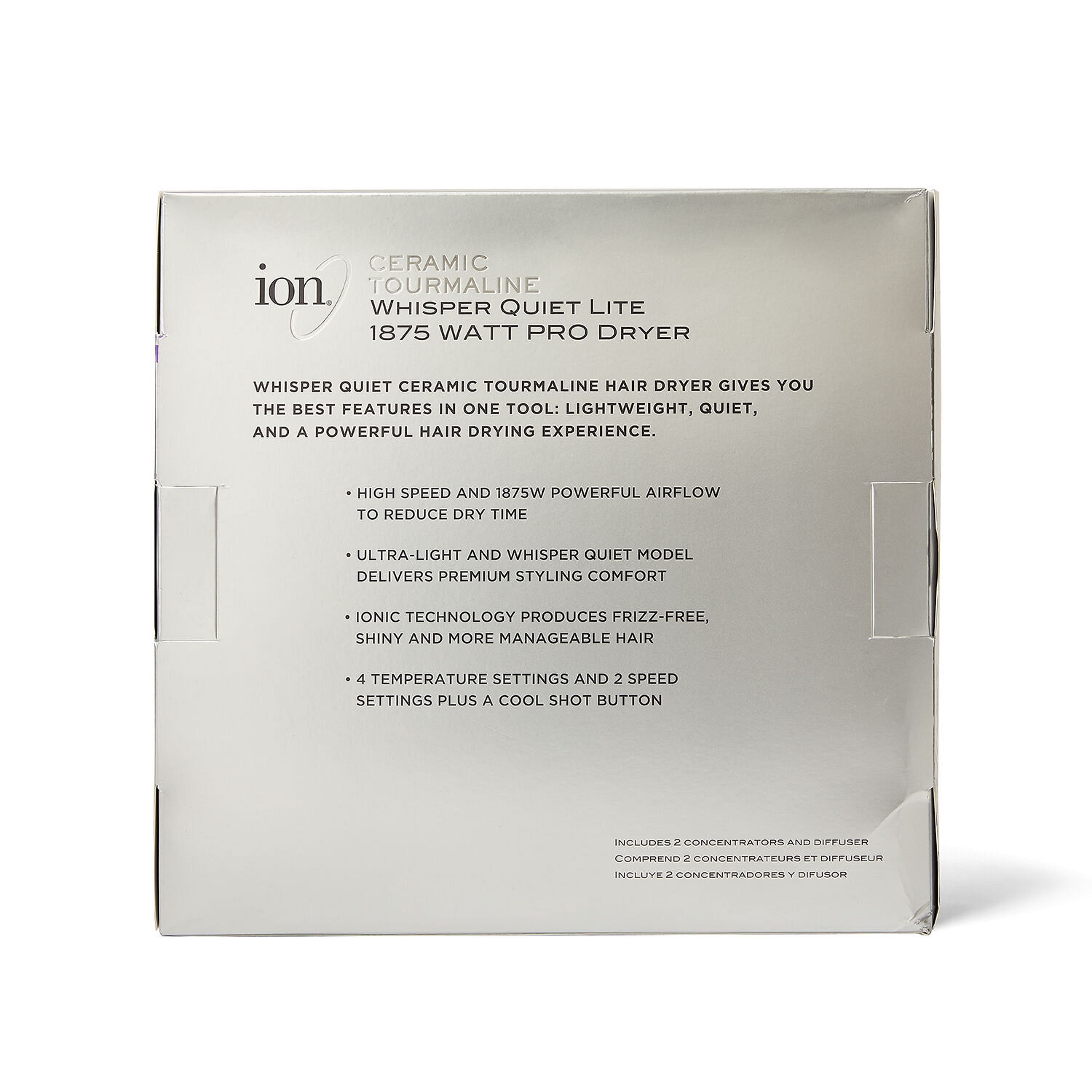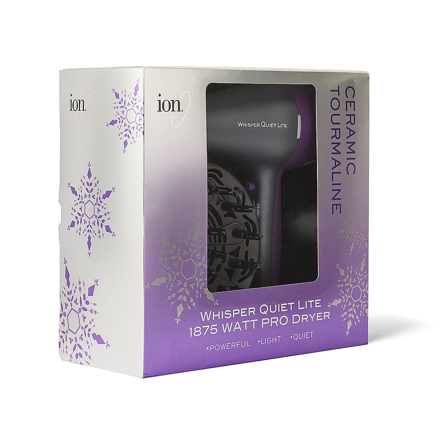 ion Whisper Quiet Lite Ionic - Ceramic Hair Dryer now in limited time Holiday colors. (1875 watts) gives you the best of all worlds in one tool: lightweight, quiet, powerful hair drying performance. The Whisper Quiet Lite Ionic Ceramic hair dryer is ultra-light (16oz), has 1875 watts of heating power, and the tourmaline ionic technology produces anti-frizz styling for beautiful, shiny, smooth hair. Has two (2) temperature settings, cool shot button, a removable filter, and 2-speed settings. The Whisper Quiet Lite Ionic Ceramic hair dryer is ultra-light and whisper-quiet with maximum power to deliver the ultimate blow drying experience. Why trade performance for convenience when you can have the best of all worlds in one tool?