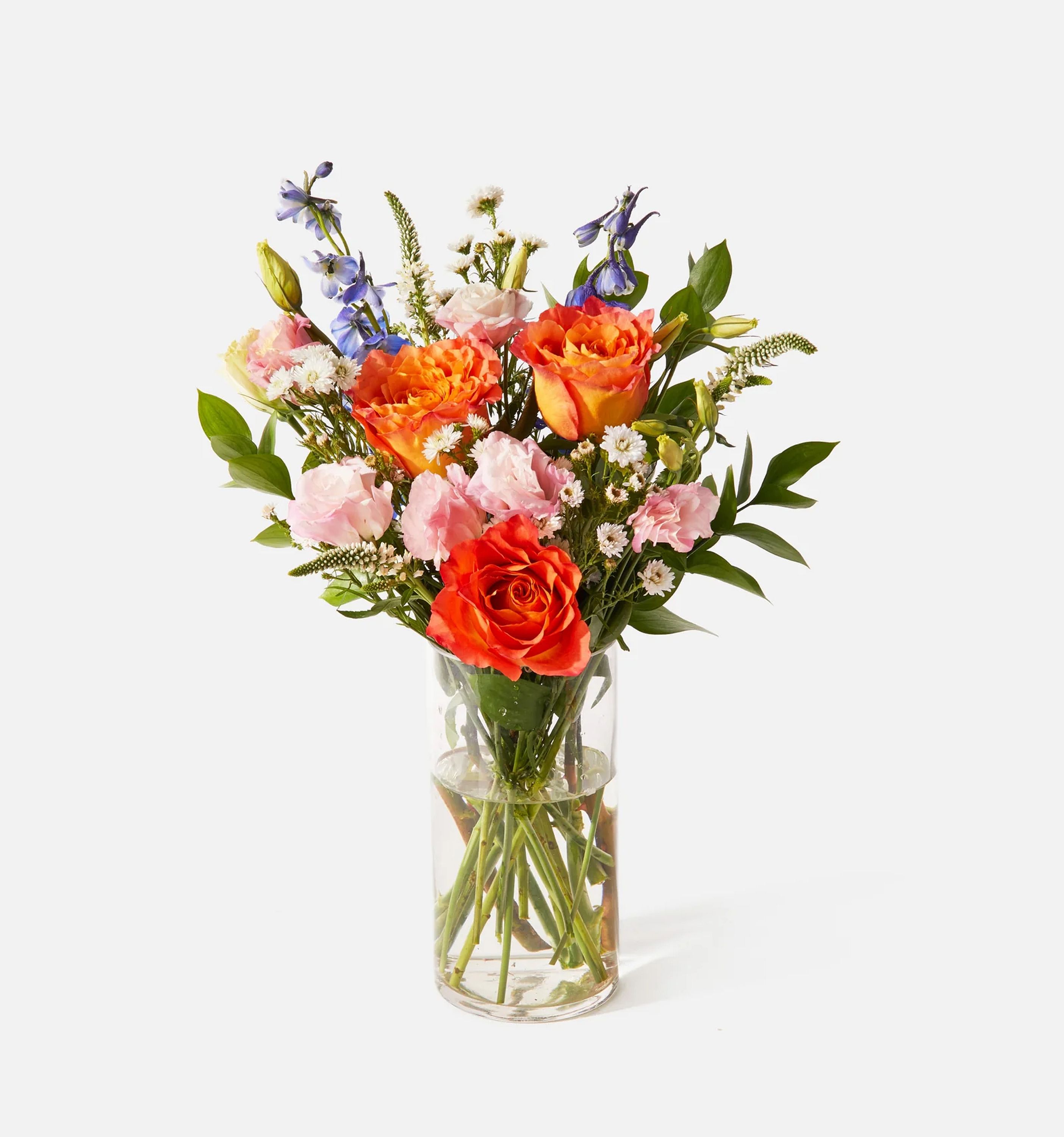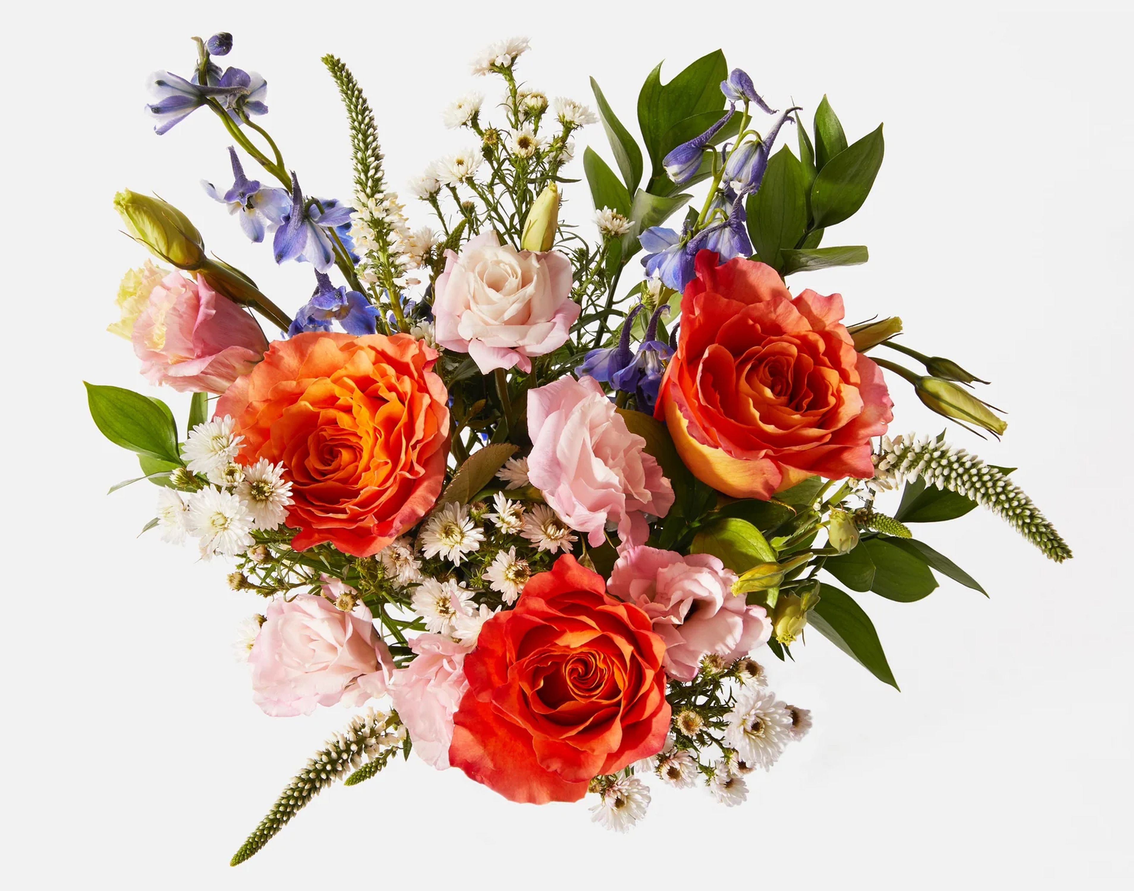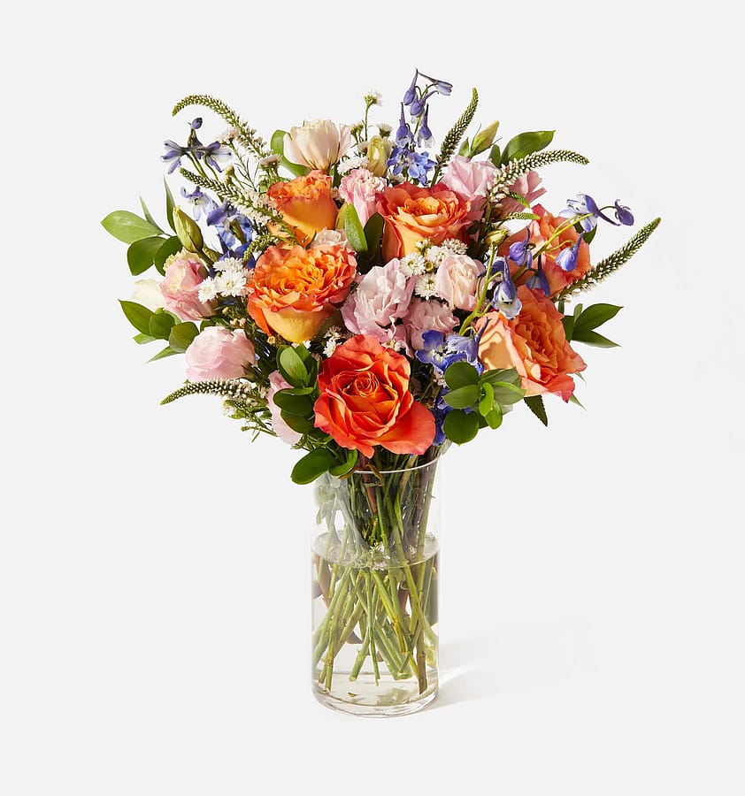 Includes: Delphinium, Lisianthus, Roses, Veronica, Aster, and Ruscus